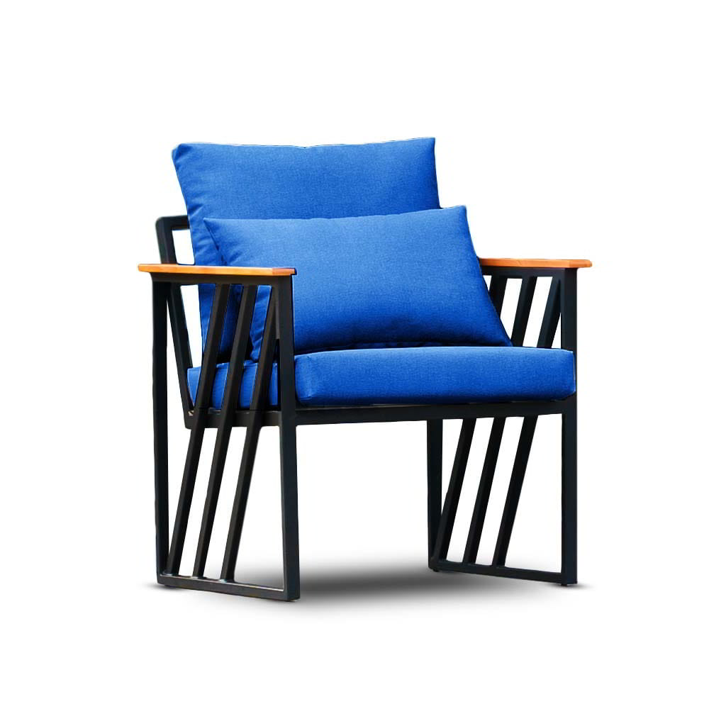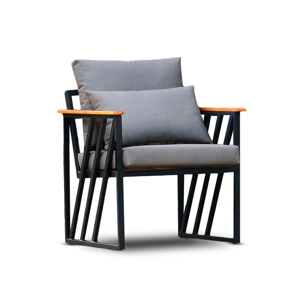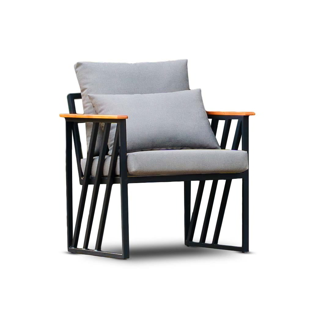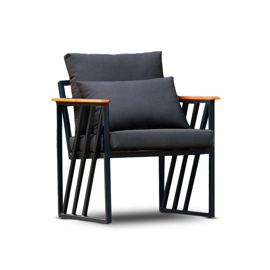 Equipado con apoyabrazos de madera de cedro tratados para resistir las inclemencias del clima, este sillón ofrece una experiencia superior de confort y estilo. Su estructura metálica pintada en polvo y sus telas impermeables, resistentes a los rayos UV, garantizan una larga vida útil y un desempeño impecable en exteriores.