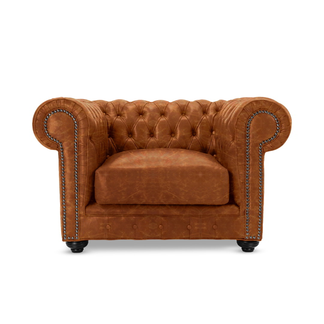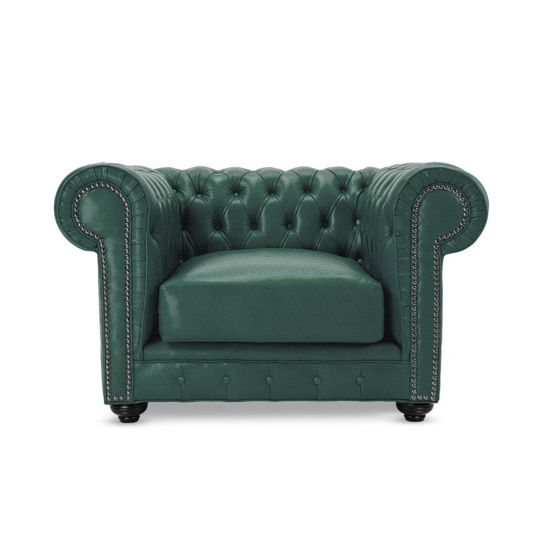 Majestuoso en presencia y refinado en cada detalle, el sillón Chester 1 plaza de estilo Chesterfield representa la fusión perfecta entre tradición y sofisticación contemporánea. Su característico capitoné abotonado en el respaldo y los brazos, meticulosamente trabajado a mano, rinde homenaje a un legado de elegancia atemporal.