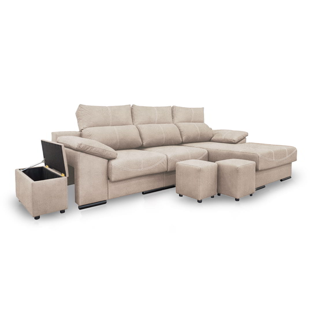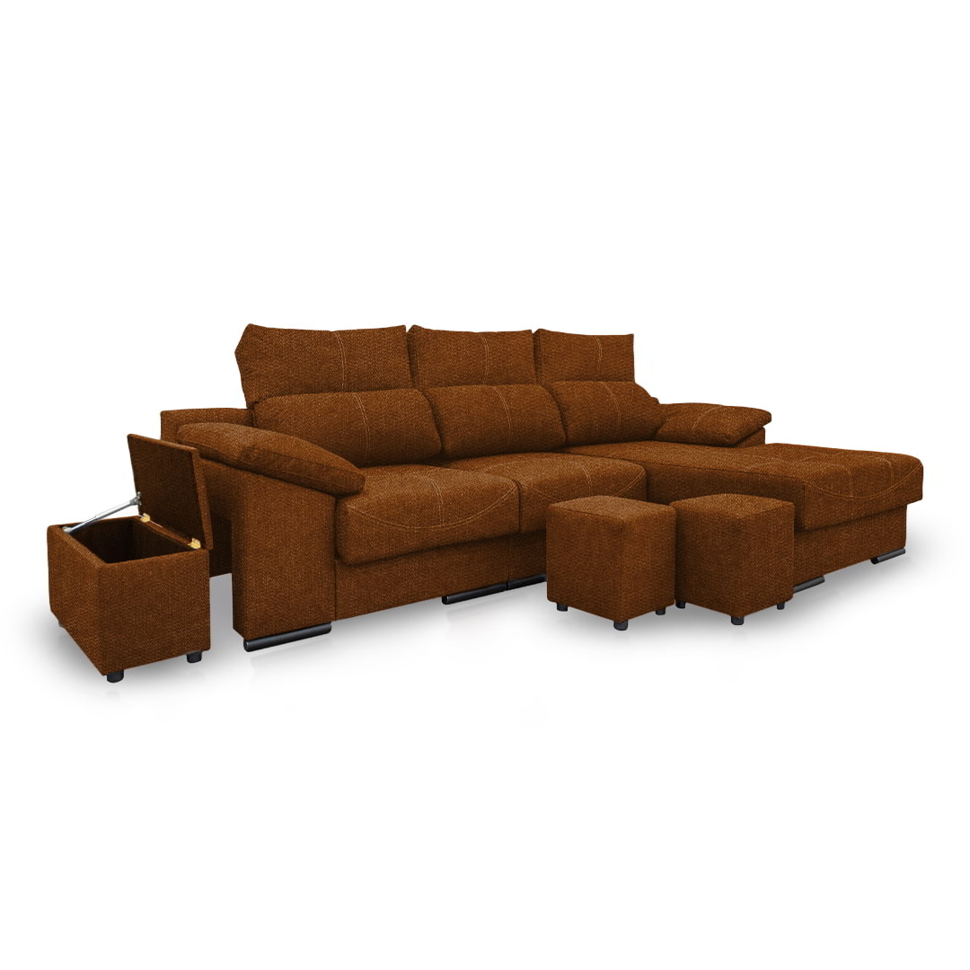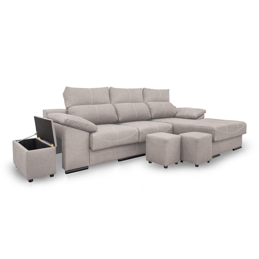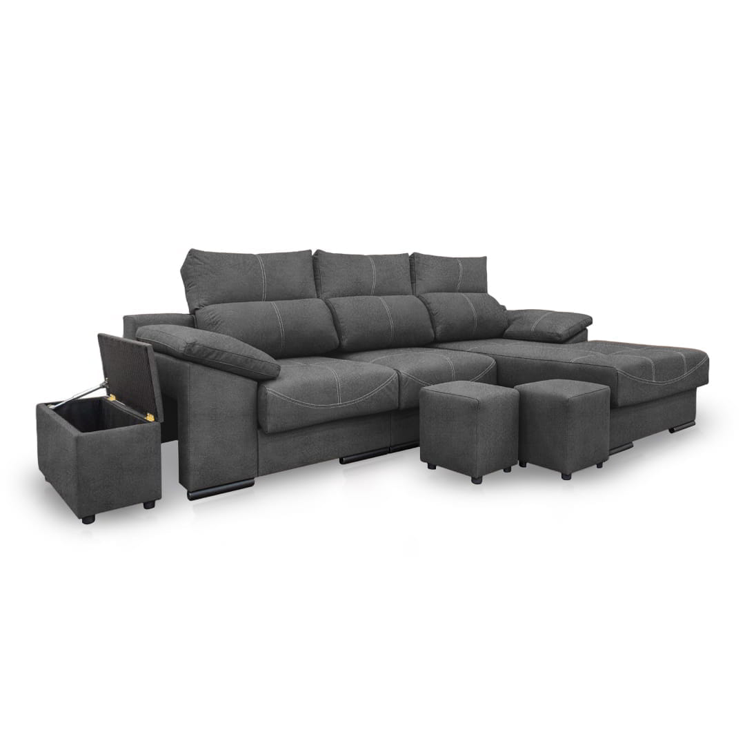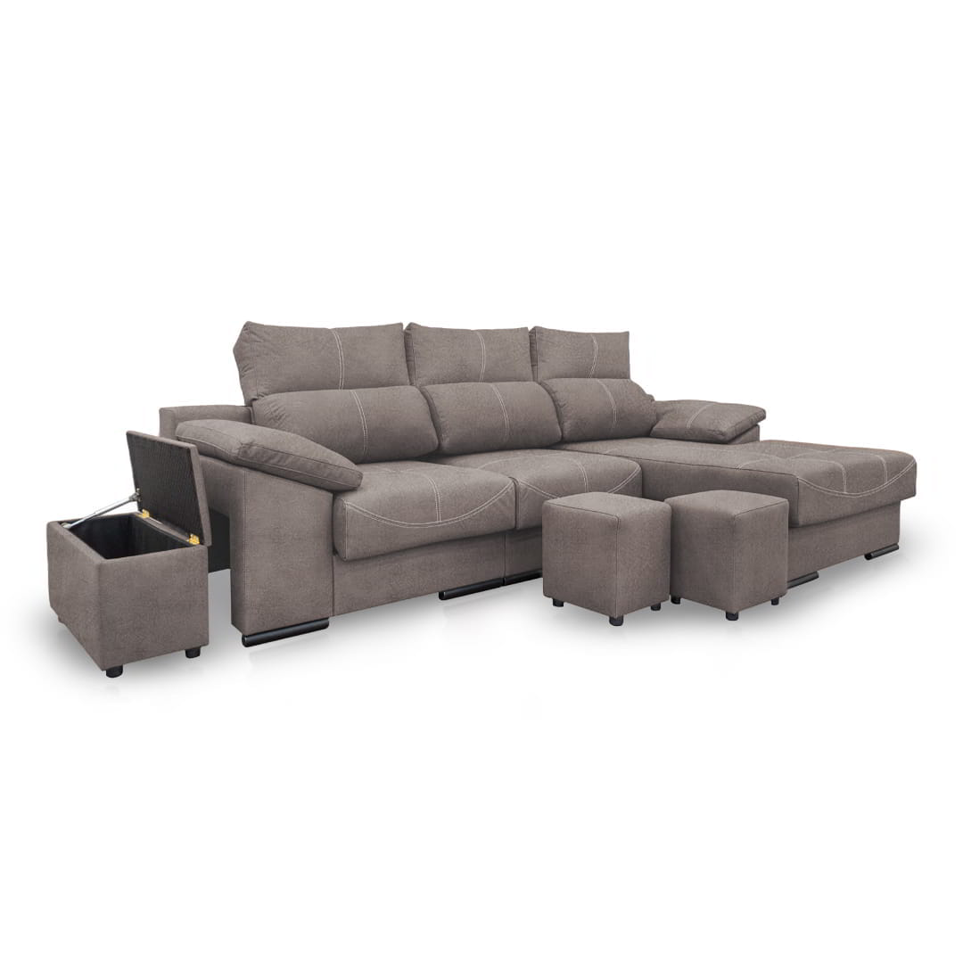 Con el diseño Phyllis, ganas un plus de espacio en casa a la hora de recibir visitas, ya que el sofá incluye en su diseño dos taburetes para ampliar tus espacios y ofrecer el máximo confort a todos. Además, cuenta con un baúl para que tengas un sitio de guardado extra al mismo tiempo que decoras tus ambientes.